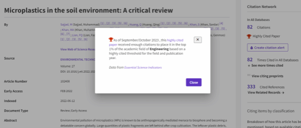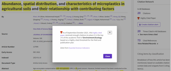 美国基本科学指标(Essential Science Indicator, ESI)2024年1月公布最新数据显示,以bv伟德国际1946为唯一单位,海南老员工态与环境公司黄青老师为唯一通讯作者,2022年2月于环境科学与生态学领域TOP期刊《Environmental Technology & Innovation》(IF=7.1,中科院二区)发表的综述论文“Microplastics in the soil environment: A critical review”,与同年12月同样是环境科学与生态学领域TOP期刊的《Journal of Environmental Management》(IF=8.7,中科院二区)发表的研究论文“Abundance, spatial distribution, and characteristics of microplastics in agricultural soils and their relationship with contributing factors”双双被入选为ESI全球前1%高被引论文。